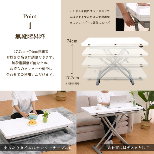 17.7cm~74cm(天板合体時75.5cm)の間でお好きな高さに調整できます。