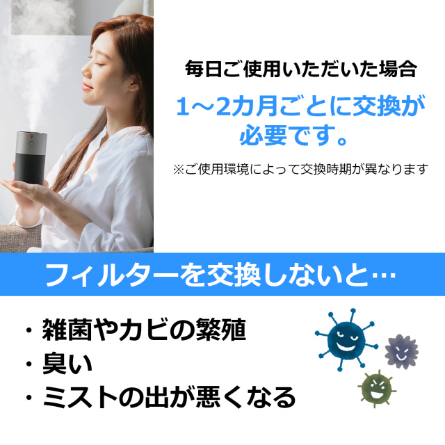 1~2カ月ごとにフィルターを交換することで、清潔にご利用いただけます。
