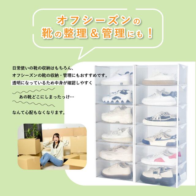 TOP 什器棚・ラック組み立て式 家具一覧棚・ラック折りたたみ 家具一覧棚・ラック 店舗引取り対象商品 シューズボックス 12個セット 折りたたみ 透明 省スペース 収納 SC-WH 価格: ¥5,990 (税込) 販売期間: 数量: 個 在庫: 45個 在庫 45個 返品についての詳細はこちら レビューはありません 折りたたみ式で簡単に設置ができるシューズボックスです。 クリアタイプなので外から靴のデザインを見ることもでき、スニーカーのコレクション用としても優秀です。 靴の管理や整理用の収納ケースにおすすめです。 縦横自由にレイアウトできます。 商品詳細 サイズ(1個あたり) 約 幅23×奥行33×高さ14.2 cm 材質 PP ABS 個数 12個入り ◆紹介動画 下の動画がご覧になれない場合はこちら ◆組み立て動画 下の動画がご覧になれない場合はこちら
