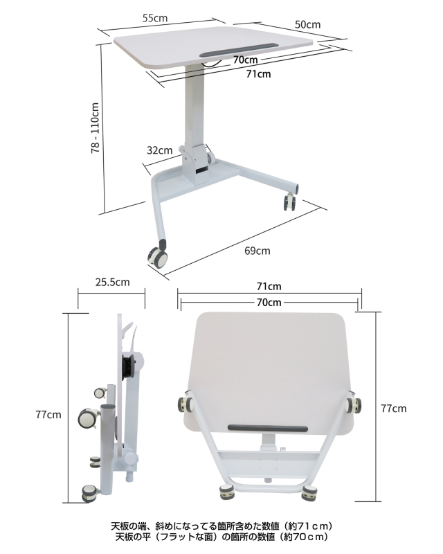 | サイズ | 天板:手前70cm奥側55cm×奥行50cm 高さ:78H~110 cm(キャスター含む) |