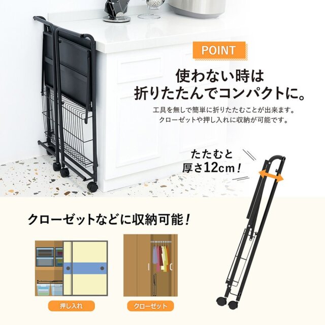 | サイズ(約) | 展開時:W56.5×D32.5cm×H84 収納時:幅12cm※キャスター含む 耐荷重:上段…15kg、中段…15kg、下段(網棚)…10kg |