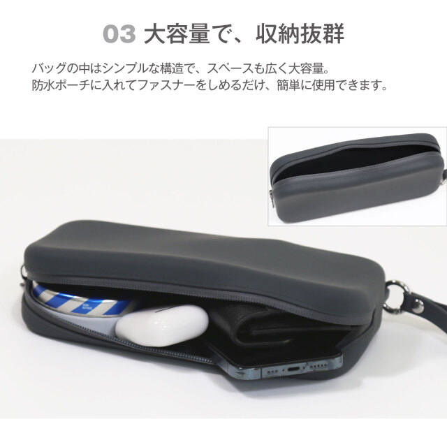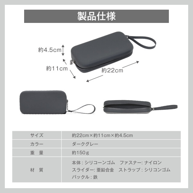 | 材質 | 本体:シリコーンゴム、ファスナー:ナイロン スライダー:亜鉛合金、ストラップ:シリコンゴム、バックル:鉄 |